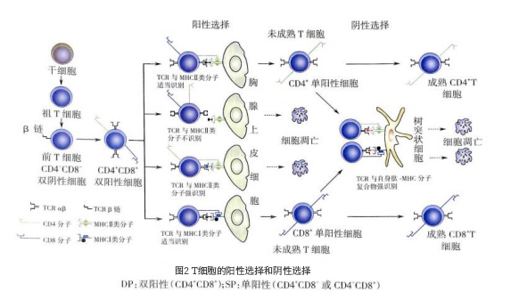 陰性選擇(negative selection)經(jīng)過陽性選擇的SP細(xì)胞在皮質(zhì)髓質(zhì)交界處及髓質(zhì)區(qū),與胸腺樹突狀細(xì)胞、巨噬細(xì)胞等表面的自身抗原肽 -MHC Ⅰ 類分子復(fù)合物或自身抗原肽 -MHC Ⅱ 類分子復(fù)合物相互作用。高親和力結(jié)合的SP細(xì)胞(即自身反應(yīng)性T細(xì)胞)發(fā)生調(diào)亡,少部分分化為調(diào)節(jié)性T細(xì)胞;而不能結(jié)合的SP細(xì)胞(陰性)存活成為成熟T細(xì)胞并進(jìn)人外周免疫器官。因此,陰性選擇的意義是清除自身反應(yīng)性T細(xì)胞,保留多樣性的抗原反應(yīng)性T細(xì)胞,以維持T細(xì)胞的中樞免疫耐受。